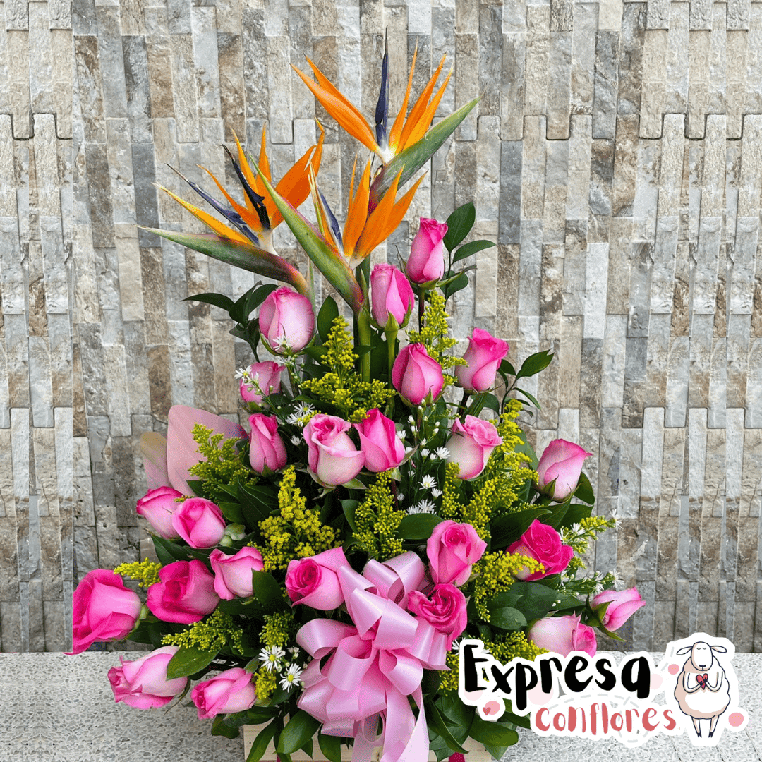 Muchas veces sentimos la necesidad de decir cosas que con palabras no podemos expresar, este delicado diseño hablará por ti, regala este hermoso arreglo floral exótico elaborado sobre una base de madera el cual se compone de 18 rosas en tono salmón o rosado, aves del paraíso y follajes verdes. Sugerimos que acompañes este diseño con chocolates, peluches o vinos para hacer aún más especial tu detalle, en el siguiente paso de la compra puedes agregar a tu orden estos productos si lo deseas.