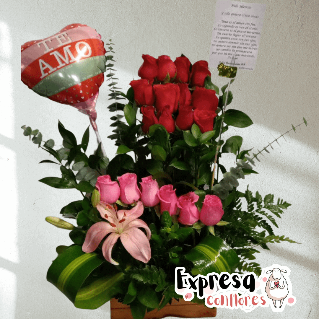 Si conquistar su corazón es lo que deseas, este diseño floral será tu aliado, envía este bello arreglo el cual se encuentra elaborado en una base de madera o similar, compuesto de 18 rosas en tonos rojo y rosado, un lirio y follajes verdes. El diseño incluye un globo metalizado “Te Amo”. Sugerimos que acompañes este diseño con chocolates, peluches o vinos para hacer aún más especial tu detalle, en el siguiente paso de la compra puedes agregar a tu orden estos productos si lo deseas.