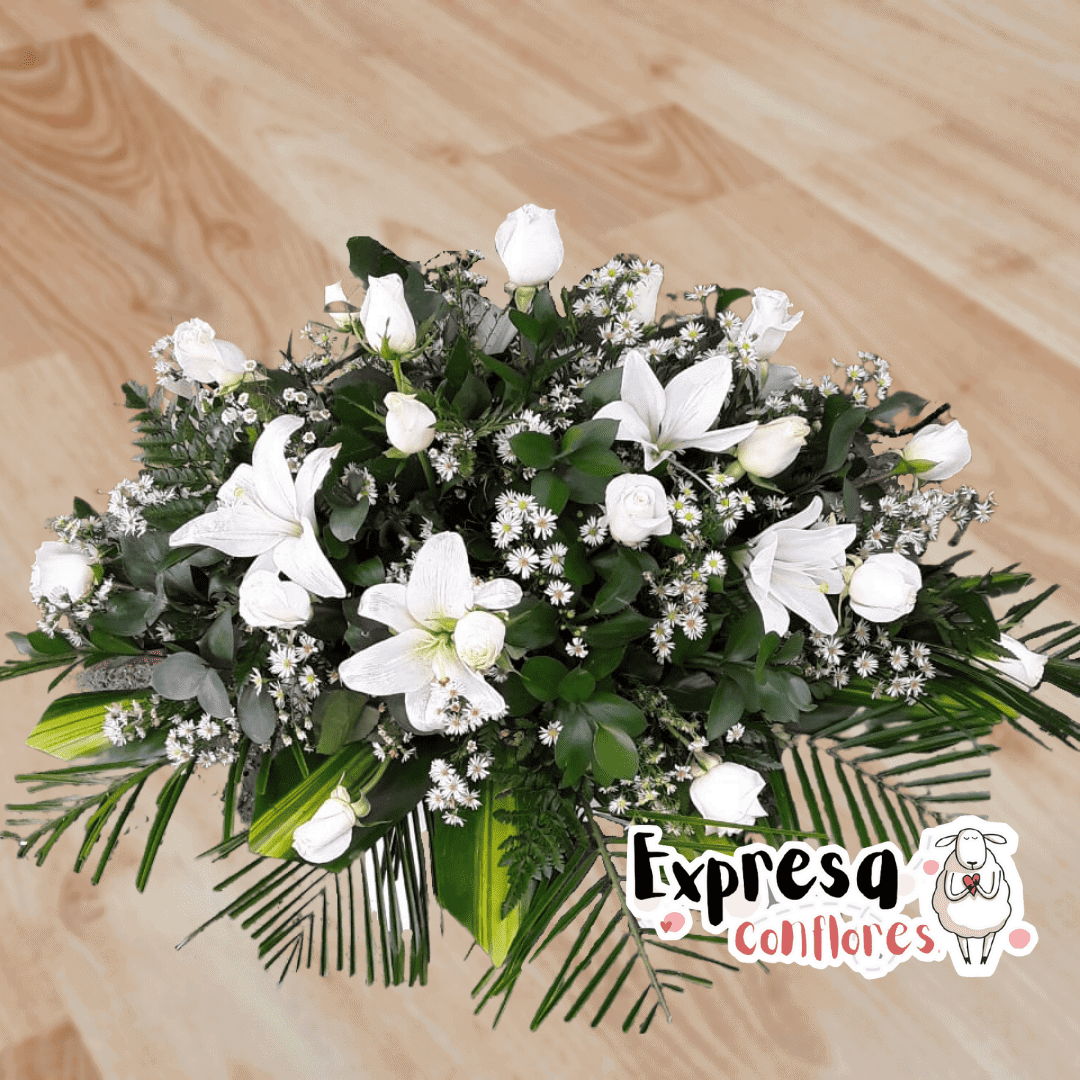 Por medio de las flores podemos expresar de forma ideal nuestras condolencias a los familiares de la persona que ha fallecido, este lindo arreglo floral cubre caja está diseñado para colocar sobre el cajón fúnebre y está conformado por 18 rosas blancas, lirios blancos y follajes verdes.