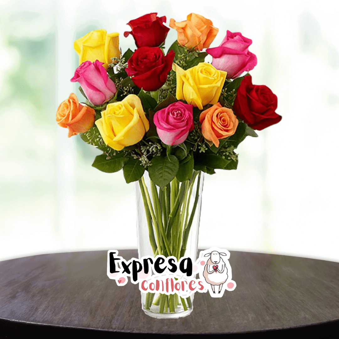 Con este colorido diseño lograrás que ese ser especial tenga un día muy especial, envía este jarrón con 12 rosas multicolores y follajes verdes, ideal para cualquier ocasión. Sugerimos que acompañes este diseño con chocolates, peluches o vinos para hacer aún más especial tu detalle, en el siguiente paso de la compra puedes agregar a tu orden estos productos si lo deseas.