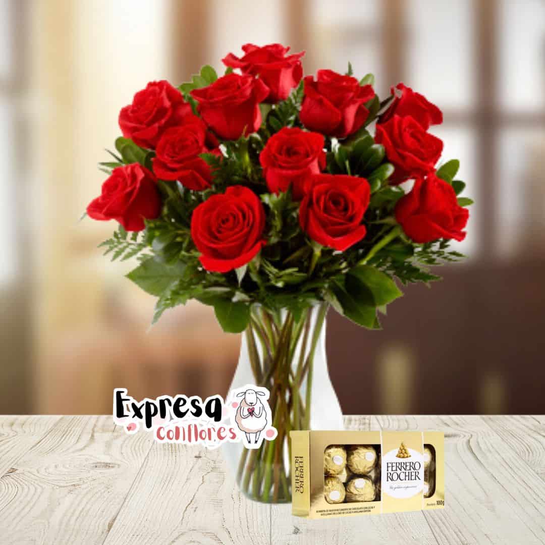 Las flores te permiten expresar tus sentimientos, son ideales para cualquier ocasión, que mejor que este sencillo y elegante jarrón de vidrio con 12 rosas y follajes verdes junto a 1 caja de chocolates Ferrero por 8 unidades. Sugerimos que acompañes este diseño con chocolates, peluches o vinos para hacer aún más especial tu detalle, en el siguiente paso de la compra puedes agregar a tu orden estos productos si lo deseas.